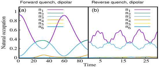 Time evolution of natural orbitals for dipolar interaction: (a) forward lattice-depth quench to ; and (b) reverse lattice-depth quench to (see text for details). All quantities are dimensionless.