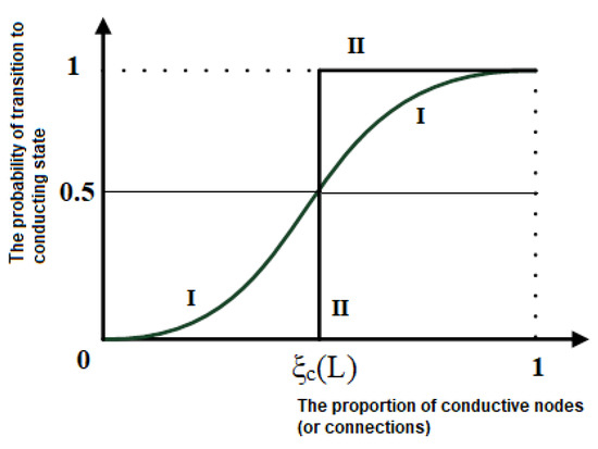 For finite size structures, conductivity can occur at different portions of conductive nodes (or links, see Figure 1). However, if the network size L tends towards infinity, the area of transition towards the conducting state becomes compact (see Figure 1, curve I for a small structure, curve II for an infinite network).