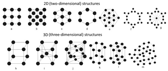 Note that, for regular structures (such as square, triangular and hexagonal 2D networks), percolation characteristics, such as percolation threshold values, cluster size, etc., can be calculated analytically [8,16,17,18,19,20], but for networks with irregular topology, as well as for many regular 2D and 3D structures, computer simulation methods should be used [12,13,14,15,32,33,34]. In our study, for the classification of regularity of structures, we do not use a graph theory definition, but a broader definition according to which any structures having at least some elements of symmetry are regular. For such structures as: a 3.122 network (see Table 1); centered square and hexagonal 2D networks; a centered 2D network with 3.122; a 3D hexagonal honeycomb structure; 3D parallel 3.122 structures with vertical links; 3D hexagonal and a number of others, percolation thresholds were defined using numerical simulation methods. For other structures listed in Table 1, percolation threshold values were cited from other studies.