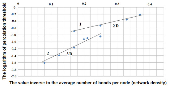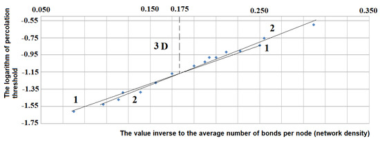 Analysis of data given in Table 2 and Figure 6 shows that, for random 3D structures, the value of the percolation threshold has an inversion point. When a network’s inverse density value is more than 0.175 (in this case, network density will be less than 5.7 links per node), the percolation threshold for the same network density will be less than for structures with symmetry, and at values lower than 0.175 (network density being more than 5.7 links per node), the situation will be inverse (see Figure 6, the inversion point is shown by the perpendicular to the horizontal axis).