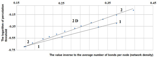 For regular structures, there are invariant parameters for the transition between 2D and 3D topological dimensions [19,38,39,40,41]. In particular, condition is satisfied for a link problem: , where x is the number of links per network node, d topological dimension (d is equal to 2 or 3) and is percolation threshold. Note that, for node problems, an invariant also exists: .