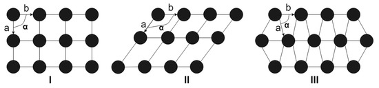 At a = b and α = π/2, for shape I in Figure 7, a tetragonal structure (square network) with a group of spatial symmetry p4mm is obtained; a ≠ b and α = π/2 is the rhombic one having a symmetry group pmm2; a ≠ b and α ≠ π/2 is monoclinic (shape II in Figure 7) with a symmetry group p112. Despite the difference in point symmetry groups (4mm, mm2, 112), these structures have one type of network, which is primitive (designated as p), sharing both the same network density and percolation threshold (equal to percolation threshold of square network, see Table 1).