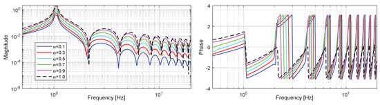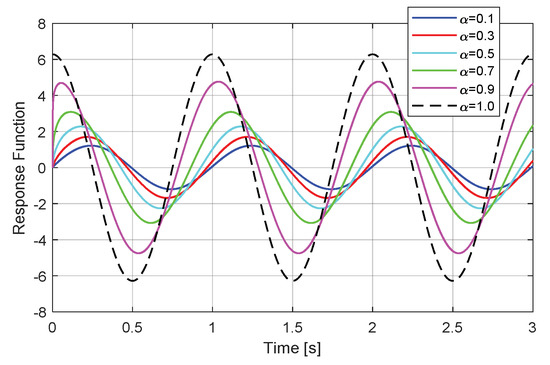 Timed evolution and spectral composition of the response function were, respectively, presented in Figure 1 and Figure 2. The results related to the regular derivative case (α = 1) were differently marked onto the graphs in order to facilitate comparative analysis. For spectral distribution, both magnitude and phase components because some changes in frequency evolution were considered and have more visibility into the phase diagram than the magnitude.