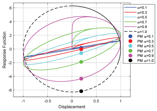 Diagram in Figure 3 presents the response function in respect of the excitation displacement. The presence of the hysteretic loop can be observed, which acquires changes as a function of fractional order. In order to evaluate the linear-like evolution of the system, a Poincare map, with a snapshot increment identical to the time period of excitation signal, was overlapped on diagrams in Figure 3. Null scattering of dots related to Poincare maps highlight the correlated evolution of the system with the excitation frequency. It has to be mentioned that, for the investigations presented into this paper, the evaluation of Poincare maps is justified by the fact that the response function is identical with the system velocity, because the model only incorporates the unitary gained dissipative term (in fact, the response function in respect to the displacement is similar with the phase plane diagram).