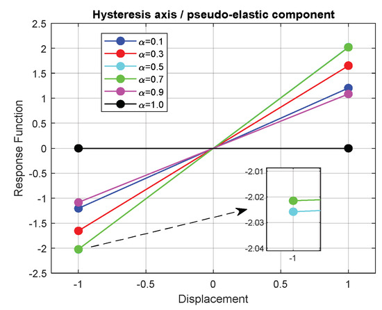 Hysteresis axes for loops in Figure 3, denoting the pseudo-elastic component, virtually emulated by the α-fractional damping model.
