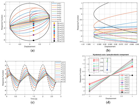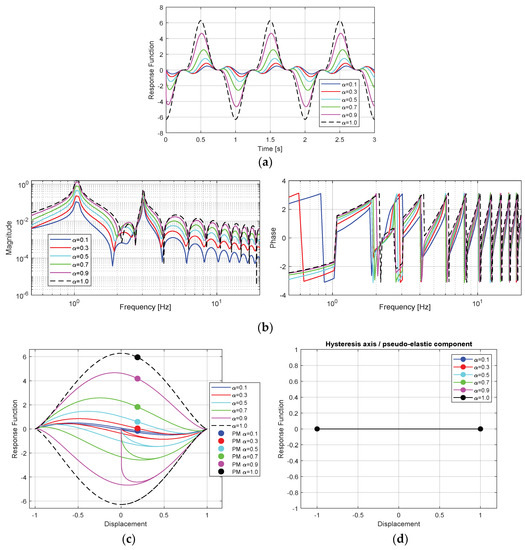 The response of α-order fractional damping VdP-based model, with respect to 1 Hz and unitary magnitude harmonic displacement excitation, in terms of timed evolution (a), magnitude and phase spectral composition (b), hysteresis loops with Poincare map (c), and pseudo-elastic component (d).