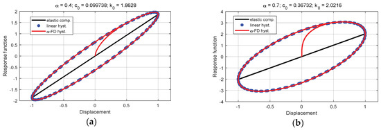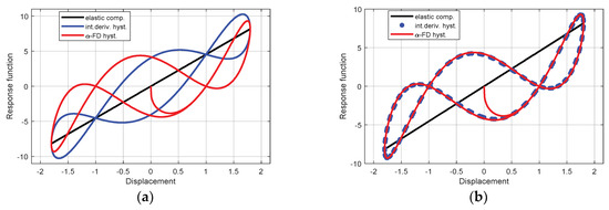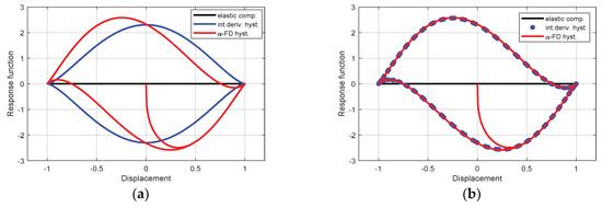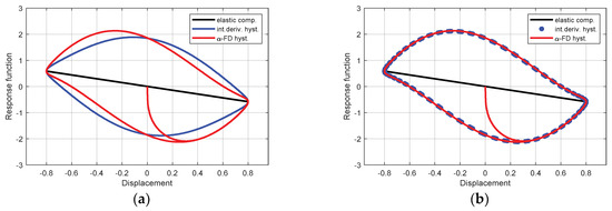 Responses hysteresis provided by the initial α-fractional dissipative and the emulated VdP-based models, respectively. The simulations were performed for displacement magnitude gained to 0.8, and in respect to emulated VdP model according to Equation (23) (a), and respectively, to Equation (24) (b). The α-order was valued to 0.7.