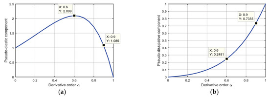 The evolution of pseudo-elastic component (a) and pseudo-dissipative component (b), respectively, for the emulated linear Voigt-Kelvin model, in respect to α-order of initial fractional derivative model.