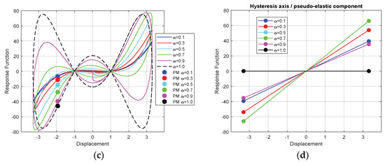 For the sake of comparison in the view of previous paragraph remarks, the diagrams in Figure 16 show the evolution of a rational-power simulated system, with quite identical material parameters to those used within this study. It was adopted in the force to displacement graphs, considering both the conservative and dissipative force components, in order to highlight the unsymmetrical hysteresis of such computational models. The conservative component of the model was supposed to have linear expression to displacement, with a constant value of rigidity.
