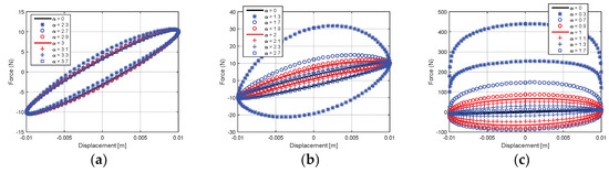 Following the aim of this study, to characterize the hysteretic behavior of vibration isolator based on α-fractional derivative approaches, the authors consider a differential formulation related to Equation (20), but ignore the inertial term. This hypothesis were justified by the assertions in paper [11], and was also mentioned and detailed by the analyses in paper [30], where an extended investigation regarding the implications of α-fractional derivative within the classic linear was developed, Duffing and Van der Pol oscillators, respectively. Different values for the main parameters were adopted and the responses, in terms of time, spectral, and hysteretic characteristics were discussed.