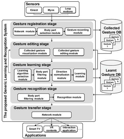The proposed framework comprises five stages: Gesture registration, editing, learning, recognition, and transfer. Figure 1 illustrates the working of the proposed generic gesture recognition and learning framework.