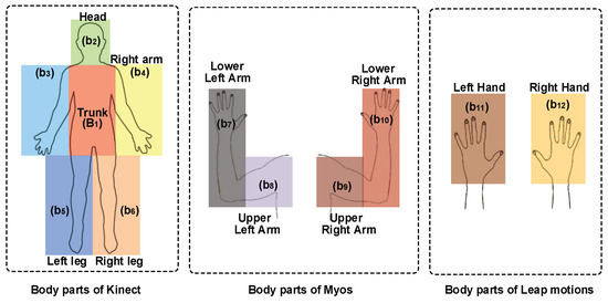 The body part selection module selects the body parts by taking the recognition accuracy into consideration. For example, when the end-user wants for the proposed method to learn gestures using the right arm, the gestures identified from body parts other than the right arm are excluded, and only the relevant gestures are learnt. Figure 2 shows six body parts recognized by Kinect, four body parts recognized by Myo, and two body parts recognized by Leap Motion.