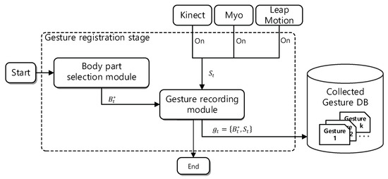 The proposed framework obtains gestures from Kinect, Myo, and Leap Motion. The gesture formats of Kinect, Myo, and Leap Motion are shown in Table 1. The gesture registration stage consists of a module for selecting the relevant body part and a gesture recording module to resister a new gesture.