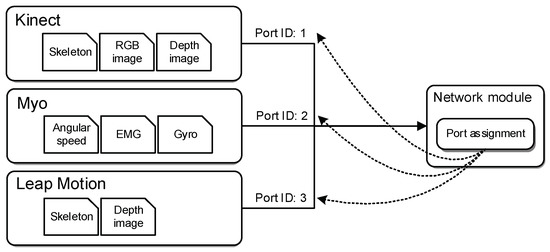 For multi-sensor data fusion, the framework obtains sensor values using different devices such as Kinect, Myo, and Leap motion. Therefore, the proposed method is susceptible to port collision when data is collected from various gesture recognition sensors through the communication model. To address this susceptibility, a port assignment module is designed that assigns a unique ID to each sensor such that the sensor can receive data from different ports, as shown in Figure 4.