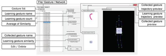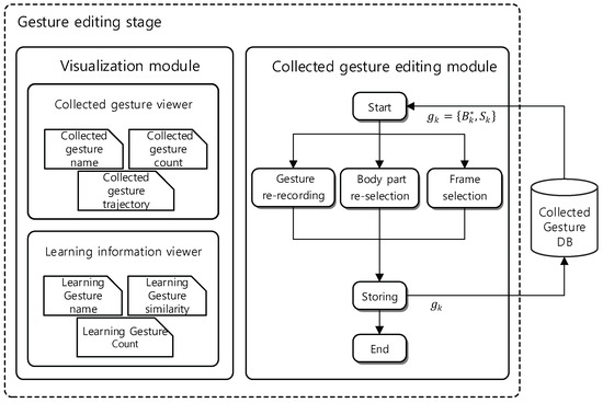 The gesture editing stage comprises the visualization module and collected gesture editing module. Figure 5 illustrates the structure of the two modules in this stage. As the name suggests, the visualization module enables the visualization of the gestures when editing the collected gestures in order to realize a more intuitive editing experience for the end-user. It consists of a collected gesture viewer and learning information viewer. Each collected gesture is associated with a name, similarity, and trajectory, and the learning information includes the names, similarities, and counts of the gestures to be learnt.