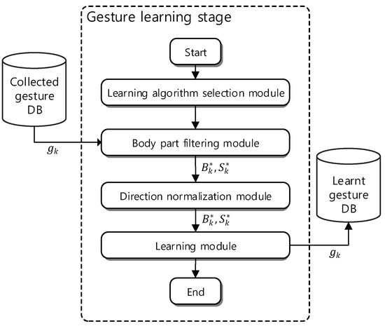 As shown in Figure 6, the gesture learning stage comprises a learning algorithm selection module, body part filtering module, direction normalization module, and learning module. First, the end-user selects an algorithm to learn the collected gestures. Second, the body part filtering increases the learning accuracy by focusing on a selected body part when collecting gestures. Third, the direction normalization module normalizes each sensor’s orientation along eight directions in order to accelerate the learning accuracy. Finally, the learning module learns the normalized gestures using the selected algorithm.
