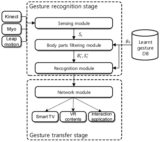 In the gesture recognition and transfer stage, the sensing module obtains gestures using Kinect, Myo, and Leap Motion. The body part filtering module filters the sensing values by considering the body parts selected by the end-user for the learnt gestures. Subsequently, the recognition module calculates the similarity of all learnt gestures, and then, the most similar learnt gesture is selected. The selected learnt gesture is deliveries provided as output to smart TVs and VR sets through the network module. Figure 7 illustrates the module structure chart of the gesture recognition and gesture transfer stage.