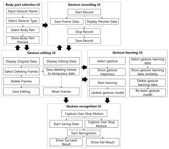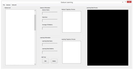 For example, Ibañez et al. [23] proposed a Kinect-based gesture recognition tool that uses only the skeleton generated by Kinect as input data, and it can visualize the results. However, this tool cannot support a variety of other sensors or perform partial recognition tasks. Further, the editing of the obtained results is not supported by the tool. Signer et al. [24] proposed a 2D-data-based gesture recognition tool with gesture registration and learning features; this tool also supports visualization and simple editing tasks. Zhang et al. [25] proposed a gesture recognition framework that uses electromyography and gyroscope data and can learn from these two datasets simultaneously. The proposed framework utilizes the hidden Markov model (HMM) algorithm as its learning algorithm. Truong et al. [26] proposed a 3D gesture recognition framework using Laban movement analysis and HMM models. Ma et al. [27] proposed an enhanced HMM model that could recognize handwritten characters in real time. In addition, the framework classified gestures into long-term/short-term gestures and dynamic/static gestures. Borghi et al. [28] also proposed a gesture recognition algorithm, which was based on the HMM algorithm, using 3D skeleton data. The proposed method divides the skeleton into upper, lower, left, and right parts and recognizes the corresponding gestures. Suma et al. [29] proposed a Kinect-based gesture recognition tool that included a network communication structure, and it could visualize end-user gestures. The learned gestures could be applied in game control using the communication system. However, this tool could not learn or recognize gestures. Gillian et al. [30] developed a gesture recognition library based on C++ that had high universality, and it supported learning and recognition and various types of input data. However, it did not offer editing features for visualizing and learning data. Gris et al. [31] used Kinect to develop a gesture recognition tool that could collect data by specifying the body parts required for the gesture. However, the tool only supported the recognition of static gestures. Maes et al. [32] proposed a recognition system based on learning gestures that enabled users to practice dancing. However, the proposed system only focused on learning and recognition, and it did not include a module to edit the data used to learn the gesture. Yavşan et al. [33] proposed an interface for gesture recognition and an NAO robot control using Kinect. In the proposed method, the learning and recognition experiments were conducted using K-nearest neighbor (K-NN) and feed-forward neural networks (FNNs). However, only static gestures were recognizable, and the system lacked editing capabilities for learning data.