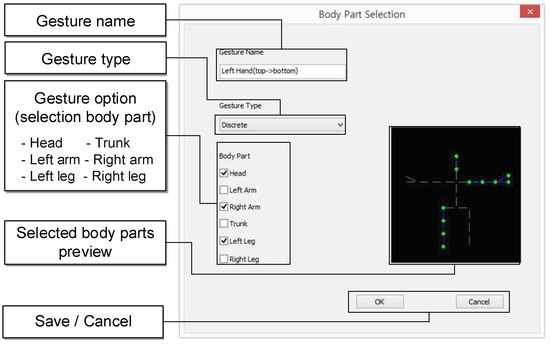 In the body part selection UI, the end-user can select the body part(s) that will be used for recording the gestures. Figure 10 shows the body selection UI for Kinect. In the UI, the end-user can select up to six parts of the body—the head, trunk, left arm, right arm, left leg, and right leg—during the gesture learning stage. As shown in the right side Figure 10, the end-user can directly select the relevant body parts.