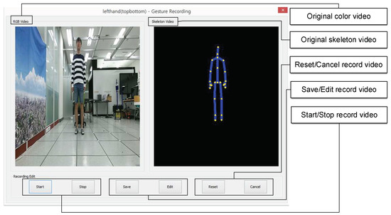 The collected gesture editing module supports functions such as gesture re-recording, body part re-selection, and frame reselection for higher recognition accuracies. If the results obtained after learning and recognition are deemed unsatisfactory, the inadequate gesture can be edited, deleted, or re-recorded through editing to obtain the appropriate gesture. In Figure 5, the collected gestures are expressed as , where k is the index of the collected gestures in the database.