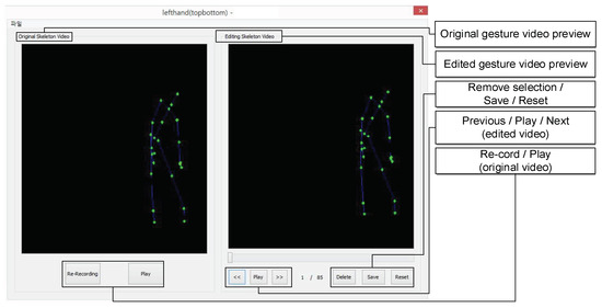 After choosing the body part, the end-user can record and save the gesture. The gesture recording UI is shown in Figure 11. In this UI, the end-user can visualize the original color video as well as the skeletal representation. The end-user can see if the recorded skeletal representation is not representative of the original color video. For example, if a frame displays an inappropriate motion trajectory of the target gesture, the inaccurate frame, in which a specific sensed value is measured incorrectly during the measurement or an empty frame is present between the recorded frames, it can be manually excluded. Moreover, learning using the obtained gestures that contain such frames leads to low recognition accuracies. Thus, the proposed method supports partial deletion and re-recording of such inappropriate frames, thereby improving the recognition accuracy.