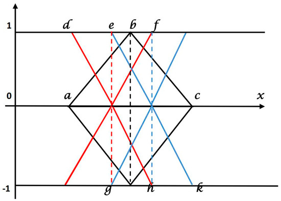 We assume areal number and an uncertain number for black line indicated triangles, the left portion area of w.r.t is is specified as the region enclosed by and the left portion of the fuzzy number Using the same concept, the right portion area of w.r.t is now consider a real number together with a fuzzy number for the left most top and lower triangles , then the left portion area of w.r.t is and is specified as the region enclosed by and the left portion of the fuzzy number Again, the right portion area of w.r.t is , a fuzzy number for the right most top and lower triangle , then the left portion removal of w.r.t is and is specified as the region enclosed by and the left portion of the fuzzy number Similarly, the right portion removal of w.r.t is
