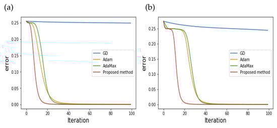 Figure 1a,b present the convergence behavior of the proposed and existing schemes (GD, Adam, AdaMax) according to iterations. As seen in the Figures, the errors of the proposed scheme decrease much faster than others for both the three- and five-layer cases. Note that GD is not even close to zero.