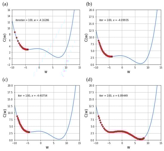 Note that the global minimum of the given cost function is located at . The starting point is and the iteration number is 100. Note that the blue line in the numerical results (Figure 2) represents a graph of the cost function according to the change of w. Ohter initial conditions of the proposed and other existing schemes are given in Table 2.