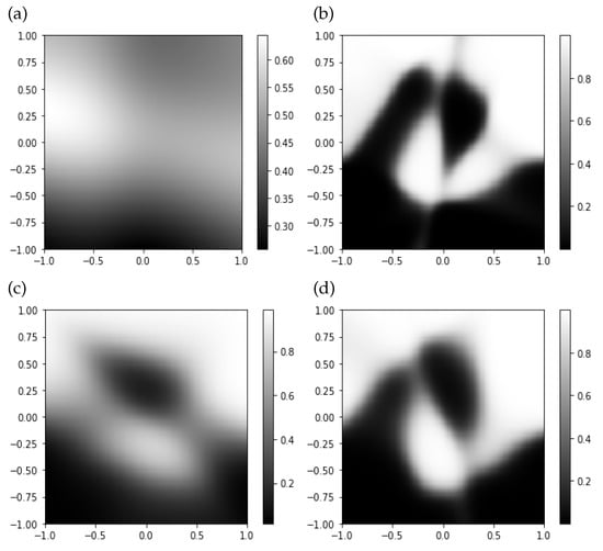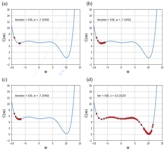 Figure 2d shows the numerical results obtained from the proposed scheme, and one can see that this scheme can find the global minimum points after 100 iteration times. However, other results seen in Figure 2a–c shows that solution behaviors of GD, Adam, AdaMax just stop at a local minimum, but not the global minimum point. Notice that even more iterations cannot help to find the global minimum.