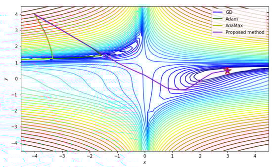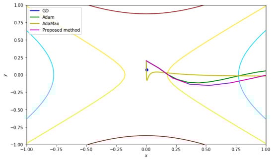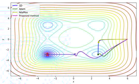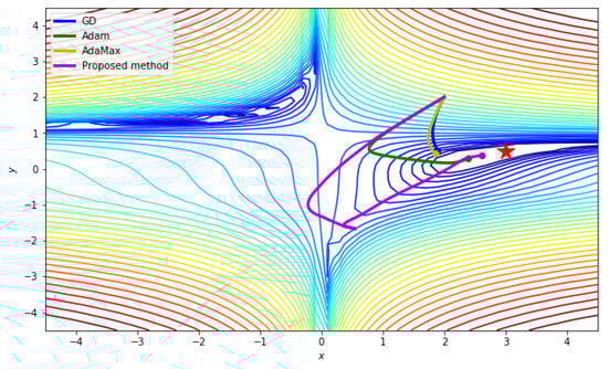 Figure 5 presents the numerical results. Note that the given cost function is non-convex around the starting point (−4, 4). The numerical result in Figure 5 shows that GD, Adam, and AdaMax fall into a local minimum and stop there, whereas the proposed scheme reaches the global minimum.