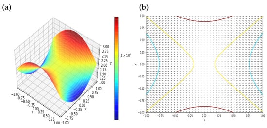 Hence, to examine the convergence behavior of the optimization scheme in this case, we set up the cost function as whose hessian matrix is , so the function has a saddle point for every point in its own domain. The function is plotted in Figure 7.