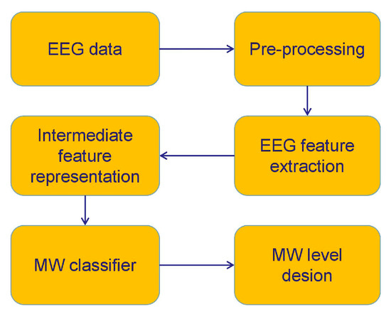 In the past few years, neural signal analysis techniques on various physiological biomarkers, e.g., electroencephalogram (EEG), electrooculogram (EOG), and electrocardiogram (ECG), have been used to provide the basis of quantitative, real-time evaluation of MW variation [7,8]. In particular, EEG features were implemented with portable recording devices as useful MW indicators in well-documented works. Since the EEG reflects the functionality and cognitive states of the central nervous system, it has been widely used to evaluate the MW. The reported works showed that the MW can be accurately predicted by analyzing changes in EEG power spectral density (PSD) [9,10]. The input data used in the experiment is a matrix. The number of rows in the matrix represents the number of samples, and the number of columns in the matrix represents the number of EEG power spectral density features. The specific element values in the matrix represent the values of the features of the current sample.
