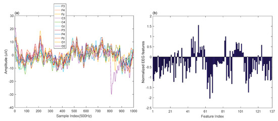 The raw EEG data in (a) a 2-s segment of 11 channels and (b) the corresponding 137 EEG features.