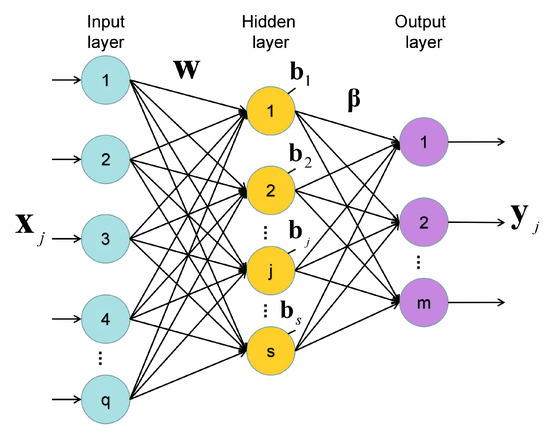 ELM is a fast-training modeling approach based on SLFN [44,45]. Figure 3 shows a typical SLFN-based ELM architecture, where is the input sample array and the corresponding output label array is . Let denote the input weights, output weights, and bias of the hidden neuron as , , and , respectively. Training a SLFN as an ELM is equivalent to minimizing the output error between the target output and model output regarding to the parameters, , and , i.e.,