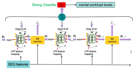 To improve the classification accuracy of MW on EEG datasets, we introduced the ELM classifier ensemble to find different individual personalities existing in EEG features. The framework of the ELM ensemble is designed based on the adaptive boosting algorithm (Adaboost) [47]. In the classical boosting algorithm [48], each training instance is given with an initial weight before the training procedure begins while the value of the weight is automatically adjusted during each iteration. In particular, the Adaboost algorithm adds a new classifier in each training iteration and additionally constructs several weak classifiers on the same sample pool. A strong classifier can thus be integrated via those weak classifiers.