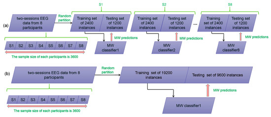 Training and testing data splits for mental workload classifiers: (a) Case 1: For each participant, two-session EEG data of 3600 instances were divided into training and testing sets of 2400 and 1200 instances, respectively; (b) Case 2: Two mutually exclusive training and testing sets with the sample size of 19,200 and a testing 9600 were used.