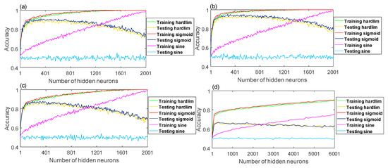 Figure 6 depicts the training and testing accuracy of the classical ELM classifier under Case 1 and Case 2 with a different number of the hidden neurons employed. Three different activation functions of the ELM, i.e., hard limit, sigmoid, and sine functions, were investigated. In the training phase of both cases, we found that the sigmoid and the sine functions possess the fastest and the lowest convergence rates respectively. The training accuracy of the ELM monotonously rises under all activation functions and the perfect training performance is achieved when a sufficient amount of hidden neurons is adopted. The testing accuracy of the sine function for both cases achieved the lowest value, and is just slightly better than random guess. The highest testing accuracy under the hard limit function in Figure 6a–c outperforms that of under sigmoid activation function. Specifically, in Figure 6d the hard limit function is slightly better. The observation indicates the effectiveness of the activation function for the ELM model is related to the size of the EEG feature set.