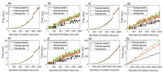 In Figure 7, the average computational cost for training and testing an ELM classifier is presented. It is shown both of the training and testing time is positively correlated with increase of the number of hidden nodes. The time cost monotonously rises under all activation functions for two cases and the testing time duration is much smaller than that for the training. By observing the line plots, the computational burden under Case 1 is less than that under Case 2 because of a smaller sample size. We can note that the testing time under hard limit function achieves the least value in Figure 7b,d,f,h. There is no obvious difference for sine and sigmoid functions in Figure 7b,d,f under Case 1. It is noted the testing time of the ELM classifier under sine function achieves the highest value in Figure 7h while the time cost across three activation functions in the training stage does not significantly vary.