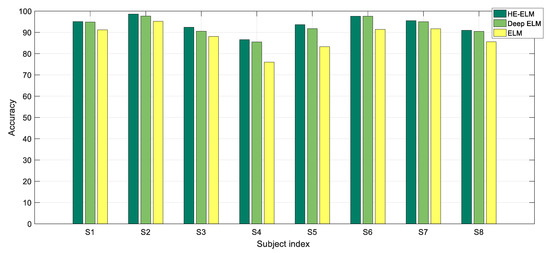 We implemented the proposed HE-ELM to generate participant-specific MW classification testing accuracy. In Figure 8, the performance of all subjects for HE-ELM is compared against the deep ELM and the classical ELM under an optimal network structure. The histogram indicates the accuracy of the HE-ELM, and the ELM classifiers achieve the highest and the lowest values, respectively. It is shown that the performance improvement of the HE-ELM is particularly significant for subjects D and E. The number of the iterations and the proportion of the weak classifiers of each type are listed in Table 8. From the Table, it is observed that the number of iterations and the percentages on deep ELM and NB classifiers are different across 8 subjects. The proportion of ELM is much larger than that of NB. In particular, for subject S6, only a single iteration was performed. It is because the first weak classifier had already achieved an optimal classification performance while the Adaboost algorithm cannot further improve accuracy.