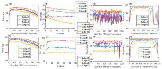 MW classification testing accuracy on 4 subjects for (a) ELM; (b) K-nearest neighbor (KNN); (c) artificial neural network with single hidden layer (ANN); (d) denoising autoencoder (DAE); (e) deep ELM; (f) local preserving projection (LPP)-KNN; (g) LPP-ANN and (h) LPP-DAE vs. different model hyper-parameters. The hyper-parameters of ELM, ANN, DAE, deep ELM, LPP-ANN and LPP-DAE are the number of hidden neurons. The hyper-parameter of KNN and LPP-KNN is the number of the nearest neighbors (denoted by k).