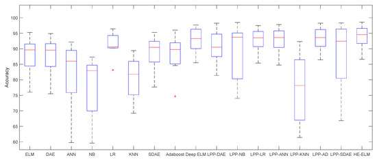 Next, we compared the performance of the HE-ELM classifier against the classical ELM, K-nearest neighbor (KNN), artificial neural network with single hidden layer (ANN), denoising autoencoder (DAE), logistic regression (LR), Adaboost based on the decision tree, stacked denoising autoencoder (SDAE), and NB MW prediction models. In addition, the LPP-based feature mapping is adopted to produce eight deep-structured classifiers denoted by deep ELM, LPP-KNN, LPP-ANN, LPP-DAE, LPP-LR, LPP-AD, LPP-SDAE, and LPP-NB.