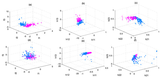 3-D scatter plots of the EEG feature abstractions for low and high MW classes extracted from EEG features from two subjects, (a–c) S2, (d–f) S3. Subfigures (a,d) visualize the EEG features; Subfigures (b,e) depict the outputs of the first hidden layer in HE-ELM; Subfigures (c,f) show the outputs of the activations in the second hidden layer.