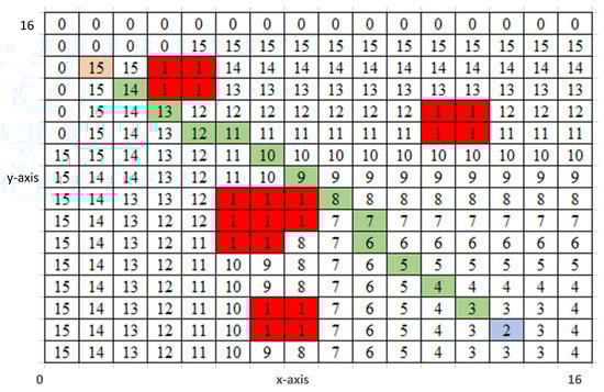 where is cost from start to current node and is the heuristic estimation of cost from current node to goal. The cost of start position is initialized with zero, and cost of every other vertex in the map is set to infinity. If is found empty, then the algorithm terminates, reporting that no path exists. If is not empty, then it originates a continuous process from goal position towards start position to build a cost matrix based on minimum Euclidean distance. In each iteration, the node with minimum cost is added in the ; this process continues until source is visited. If the visited vertex is not in goal position then it is removed from and placed in for further expansion. If the visited vertex is a goal position then the grid cells are backtracked to generate a linear piece-wise path from goal position to source position. During this backtracking, fewer grid cells are traversed and processed than previous grid-based approaches. This phenomenon leads to path generation with much improved time and memory efficiency. Long and heavily populated cost matrix in previous approaches such as A* and HPA* require planner to explore whole grid matrix during the planning process, as shown in Figure 2. However, MEA* inserts only nodes with minimum cost in the and generates a path with efficient grid matrix exploration; see Figure 3.