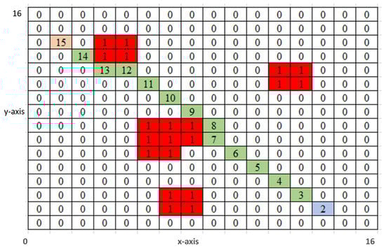 MEA* finds a collision-free path in reduced computational time as compared to previous approaches [,]. In addition, MEA* also eliminates any chance of multiple paths, see Figure 3. During each iteration, MEA* selects a neighboring grid cell for expansion which has minimum Euclidean distance. The expansion of cost matrix is performed using a heuristic function , which is based on selective Euclidean cost. The final path is further pruned using the line-of-sight principle.