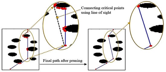 Once a path is found, a pruning process similar to HPA* is applied to the solution path. The pruning selects points that are directly connectable by collision-free straight lines using the line-of-sight algorithm as shown in Figure 4. The final path generated after the pruning process comprises fewer waypoints than A*, see Figure 5a,b. Therefore, MEA* selects only pruned points as waypoints of the final path. This phenomenon makes the final path more efficient with respect to memory requirements and execution. Moreover, during the pruning process, a safe boundary distance is maintained according to the size of robot. The steps of MEA* are shown in Algorithm 1. The pruning algorithm is shown in Algorithm 2.