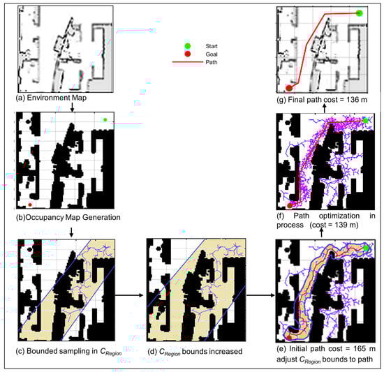 If the path is not discovered during the first scan of then is increased gradually to enhance until a path is found, as shown in Figure 6c,d. In the case of an extremely complex scenario such as a maze environment, can be increased to grow up to the full environment map. Use of the narrow makes sampling and exploration biased towards the goal as shown in Figure 6c. The final path is optimized using three more techniques called concentrated sampling, node rejection, and path pruning. A relatively narrow is acquired in the close neighborhood of the initial path for concentrated sampling. Frequent rewiring operations gradually improve the path during this process. At the same time, node rejection technique improves the path by rejecting high-cost nodes. Finally, global pruning technique [] further optimizes the path. Steps of RRT*-AB are shown in Algorithm 3.