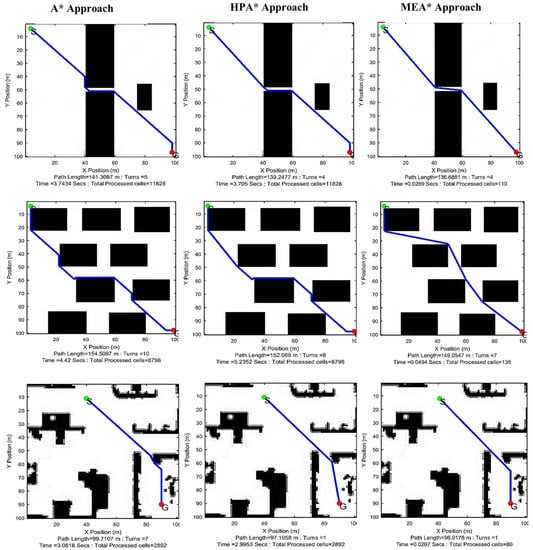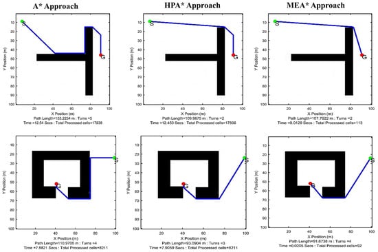 This section presents discussion of results and comparison of MEA* with other approaches. Results of all approaches are shown for maps M1 to M2 in Figure 7 and for maps M3 to M5 in Figure 8. Path length, execution time, total number of turns, and total number of cells processed in the grid are also shown along with visual comparison. The results show that MEA* [] performs better than A* and HPA* based on the following parameters: number of turns, execution time, and memory requirements.