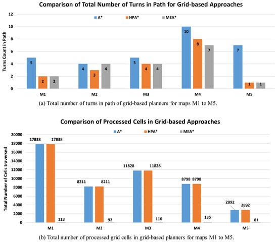 The main factor of improved performance is that MEA* inserts only a single neighbor, which is selected based on minimum Euclidean cost in , whereas A* and HPA* insert all neighbors in openList. This makes openList short and comprising useful nodes only, thus the total number of processed grid cells and execution time both are reduced. Furthermore, MEA* traverses fewer grid cells to backtrack the path as explained in Section 1. Moreover, path length is also reduced because pruning rejects extra waypoints. Moreover, it is also obvious from results that MEA* may generate the paths of the same length or a little longer than HPA* for a densely cluttered environment M4 due to the precedence of local optimal while selecting the neighbor to insert in the list. However, in such a scenario, MEA* still gives results with minimal computational time and much fewer memory requirements. It shows a good trade-off between runtime and path length such as HPA* but with more efficient run time. MEA* is designed to improve memory and speed at the expense of path length. Therefore, it is suitable for small-scale robot applications where they have very limited memory and computational capability on board. Such applications prefer fewer memory requirements and efficient response time of the planner as optimality criteria instead of the path length. Plots of the total number of turns in the final path and processed cells in the grid are shown in Figure 9a,b for all grid-based approaches. It is obvious from plots in Figure 9 that MEA* requires minimum memory to process fewer grid cells than other grid-based approaches, i.e., A* and HPA*.