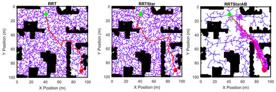 The space complexity of RRT*, RRT*-Smart, and RRT*-AB is as demonstrated in [,,]. Time complexity of an algorithm is a measure of the amount of time required by the algorithm to execute a problem of size n. Time complexity of RRT*, RRT*-Smart, and RRT*-AB is as demonstrated in [,,].