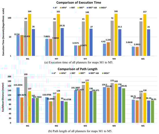 In this section, simulation results of sampling-based approaches RRT [], RRT* [], and RRT*- AB [] using maps M1 to M5 are presented. Simulation results of these comparisons are shown in Figure 10. Plots of path length and execution time for all planners and environment maps are shown in Figure 11. All simulations of sampling-based approaches are carried out 20 times using 3000 iterations. MEA* has generated paths of equal length or shorter length than sampling-based approaches. Keeping in view randomness of sampling-based approaches, if they are executed for more than 3000 iterations or given more time, then they may generate better path than A*. However, it is evident from plots in Figure 11 that there is a huge difference in execution time of MEA* with other planners. MEA* has generated a path in much less time compared to all approaches; also see Table 1. The path length of RRT*-AB is more comparable to the path length of MEA* than to other sampling-based approaches. If RRT*-AB is provided with enough planning iterations then it can provide a better path than MEA*. The MEA* can outperform RRT and RRT*-based state-of-the-art approaches only in low dimensions. As discussed in Section 2, RRT-based approaches are suitable for high-dimensional problems. Therefore, if complexity of the problem increases, RRT-based approaches will perform much better than grid-based approaches such as MEA*.